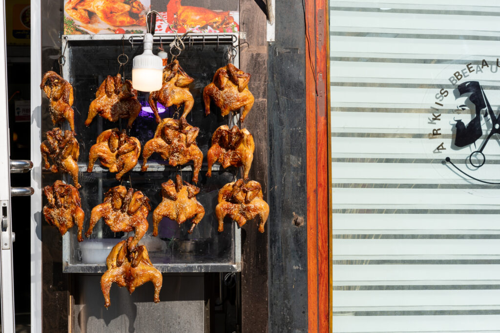 进公交站需要排队翻包检查,在公交站附近站着查手机地图也要翻包检查。我搜到了个本地人评价不错的烤鸡店。但是它在小区里,我不知道怎么进去,小区也要人脸识别,公安联网。